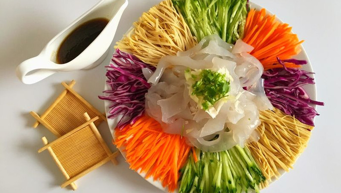 荤料(鸡丝、牛肉丝、蛋皮丝)分别摆在三角对称位置,既点缀又显档次。