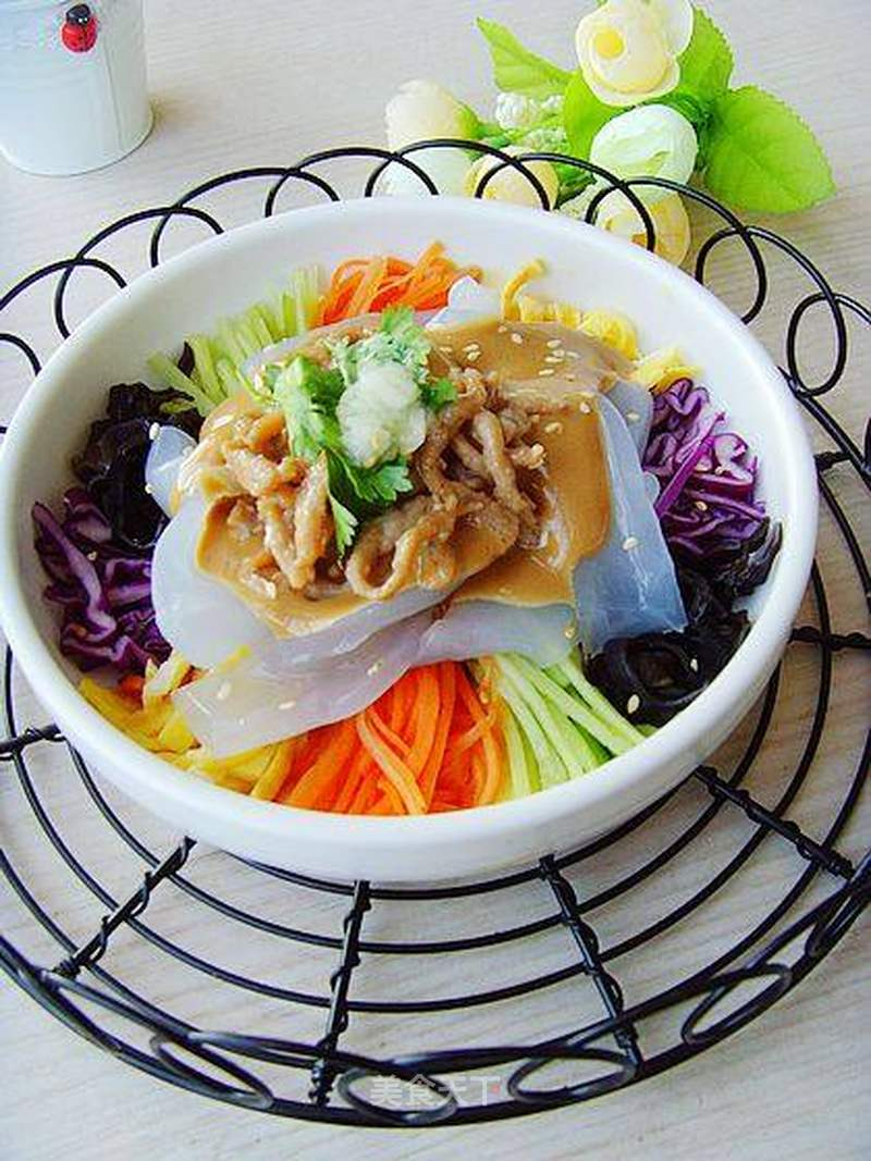 色彩鲜明:绿(黄瓜、青椒)、橙(胡萝卜)、黄(蛋皮)、红(辣椒油、红椒丝),配合粉皮晶莹剔透。