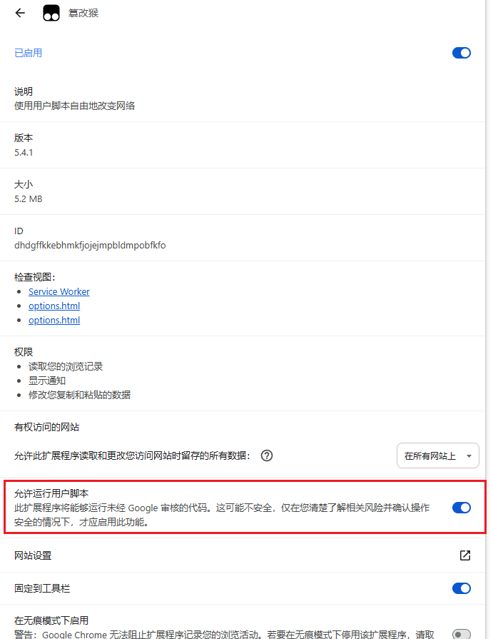 管理扩展程序,打开允许运行用户脚本