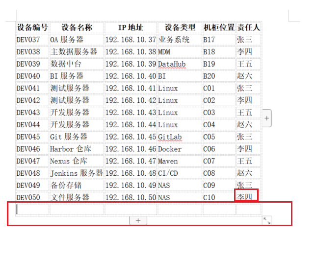 | 设备名称 | IP地址 | 设备类型 | 机柜位置 | 责任人 |