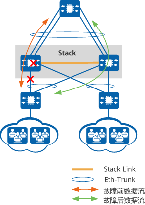 如图1-4所示,堆叠的多台成员设备之间冗余备份,当一台设备发生故障时,业务将切换至其他成员设备继续工作;另外,利用堆叠跨设备Eth-Trunk实现跨设备的链路冗余备份,当一条链路发生故障时,能确保流量切换至其他链路继续转发,保证了设备级与链路级的可靠性。
