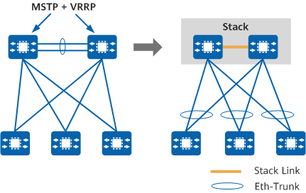 在该场景下,堆叠系统中的每台设备上行通过Eth-Trunk接口连接到核心设备上。此堆叠系统简化了汇聚设备的管理,提升了汇聚设备上行的可靠性。