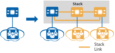如图1-2所示,当接入的用户数增加,原设备端口密度不能满足接入需求时,可以通过增加新的设备并组成堆叠而得到满足。