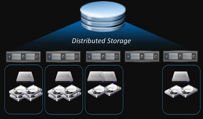 通过软件定义存储(SDS)方式,将多节点的本地盘聚合成一个逻辑存储池。