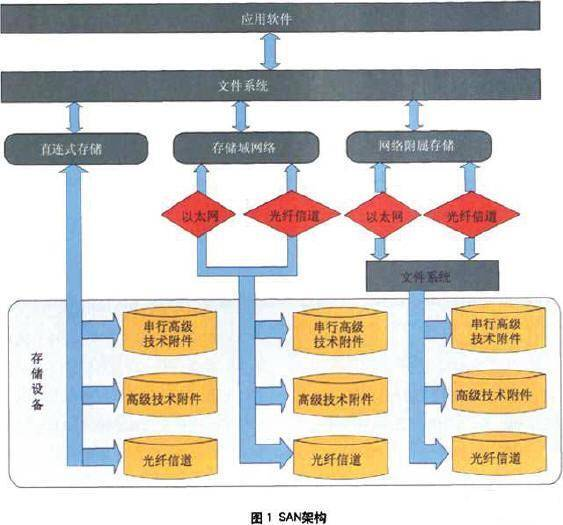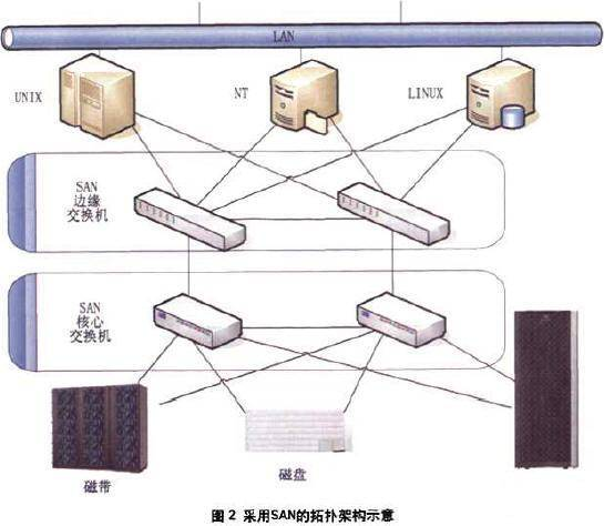 [Server群] ↔ [光纤交换机 FC Switch] ↔ [SAN存储阵列]特点: