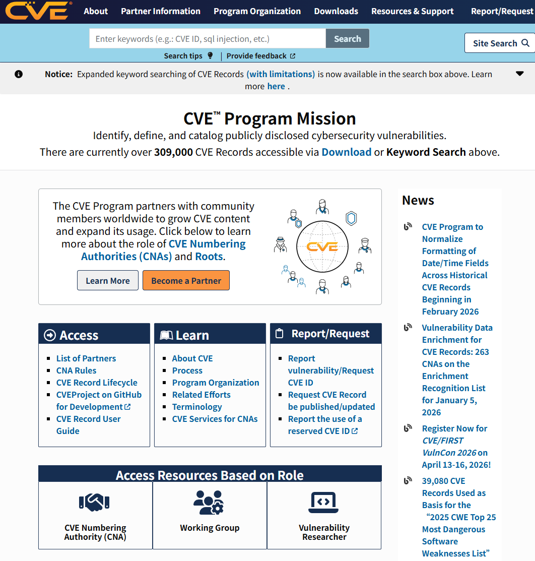 CVE 项目由 MITRE 负责维护,背后得到美国国土安全部等机构支持。