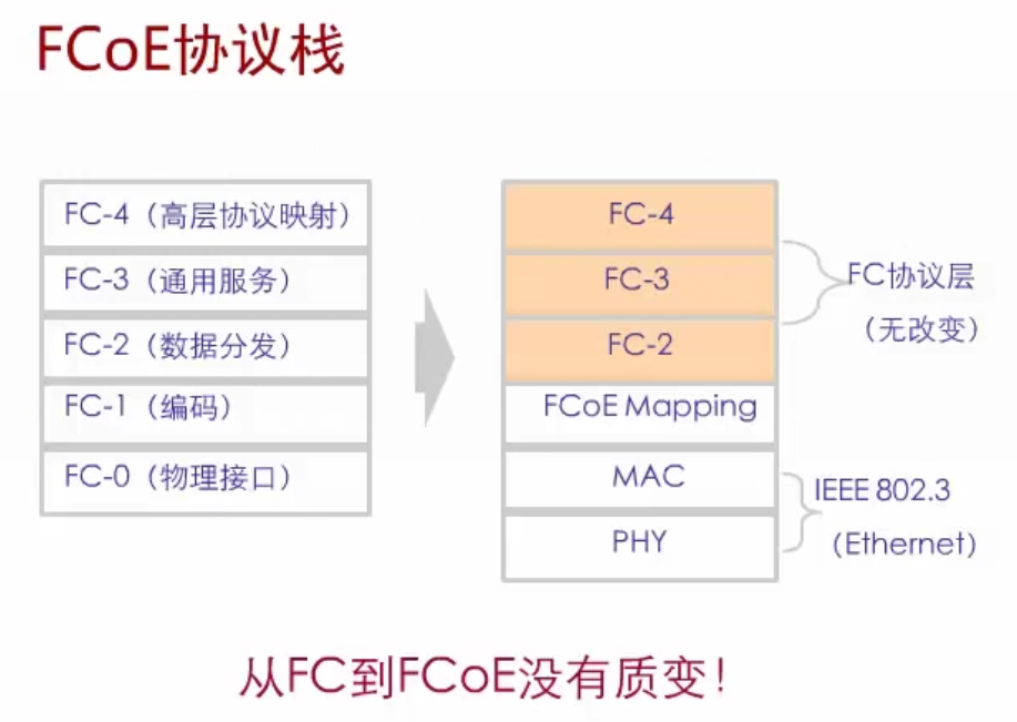 FCoE 是一种将 未更改的 FC 帧封装到增强型以太网中 的协议。它工作在 OSI 模型的 数据链路层(Layer 2) ,通过以太网物理网络传输 FC 数据,同时保留 FC 原有帧结构和控制信息。 (维基百科)