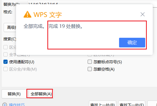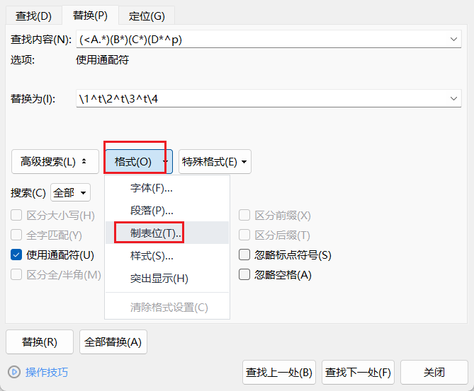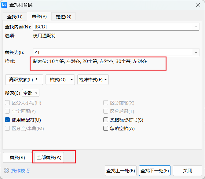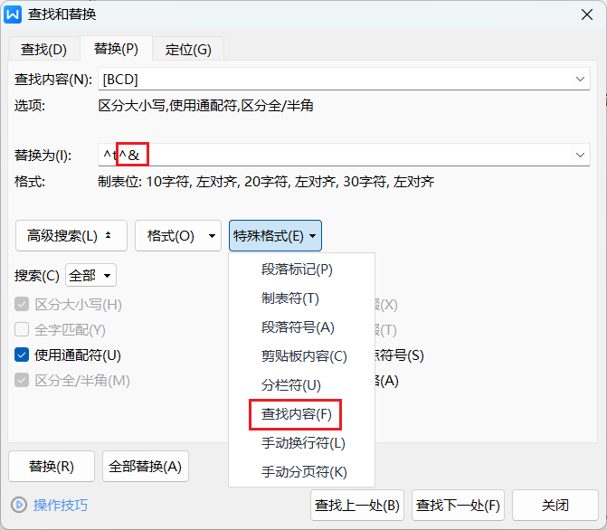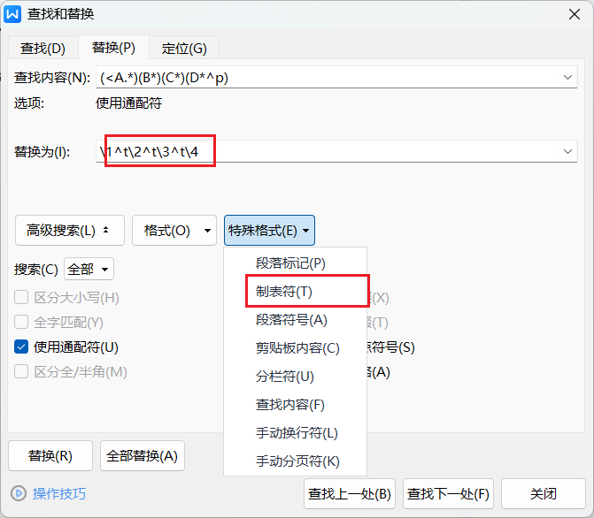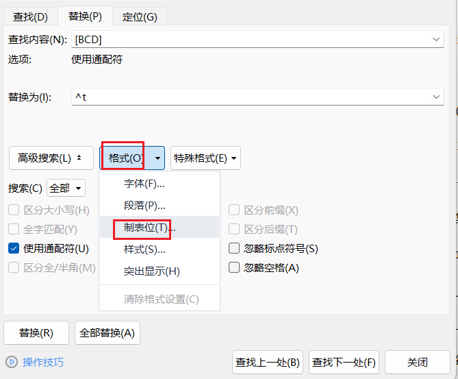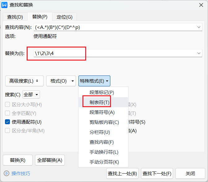 替换为对话框在找到的前面加制表符