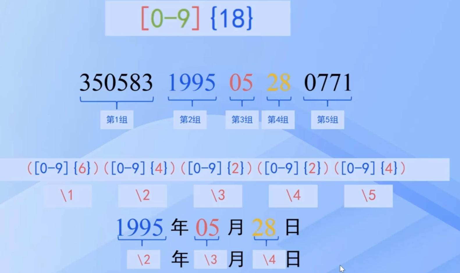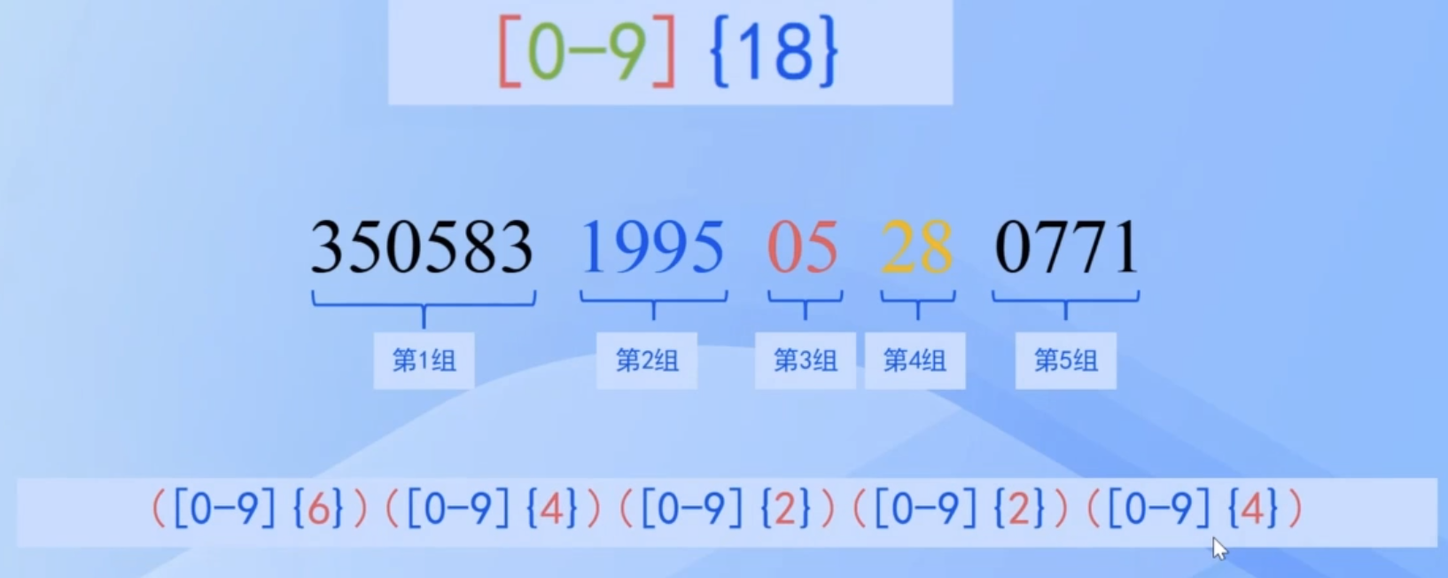 将身份证进行分组【小括号表示分组、中括号表示查找的数字范围、大括号表示长度】