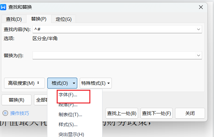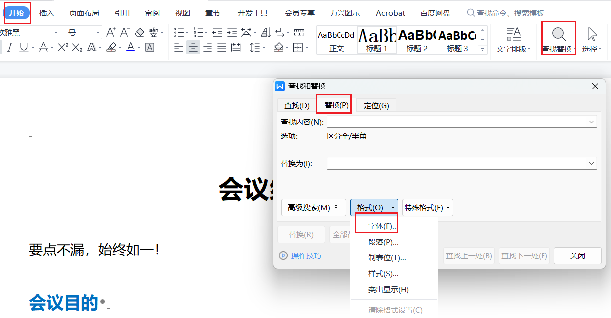 替换页面,把鼠标放在查找内容对话框,单击格式,选择字体