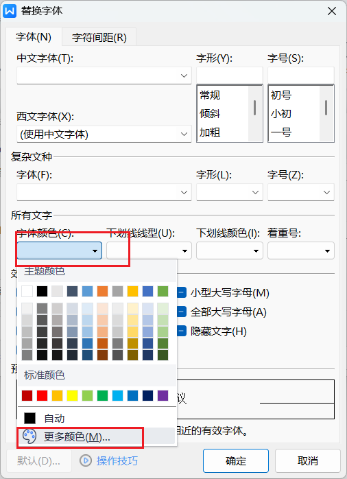 然后继续把鼠标放在替换为对话框,单机格式-字体,字体颜色选择更多
