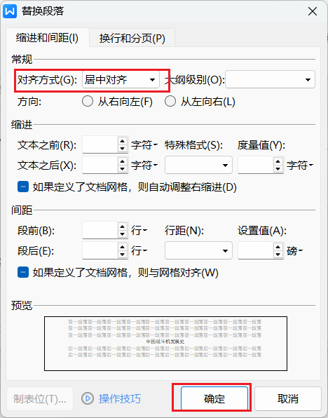 然后在替换为对话框里,选择格式-段落-对齐方式选择居中对齐