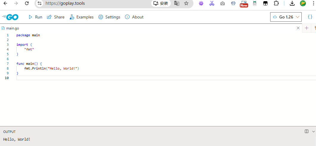 也可以通过在线网站编辑Go代码并查看运行结果,如下所示