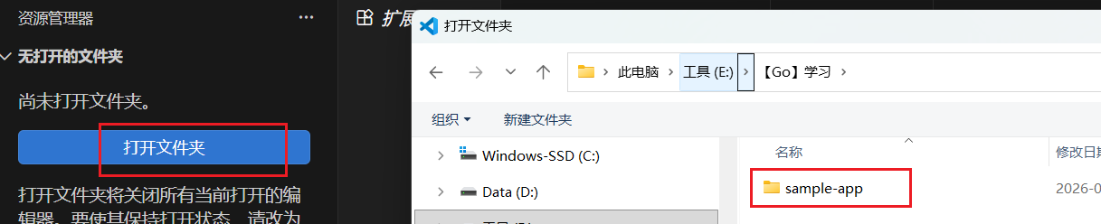 在 Visual Studio Code 中,打开 Go 应用程序的根目录。 若要打开文件夹,请在活动栏中选择资源管理器图标,然后选择“ 打开文件夹”。