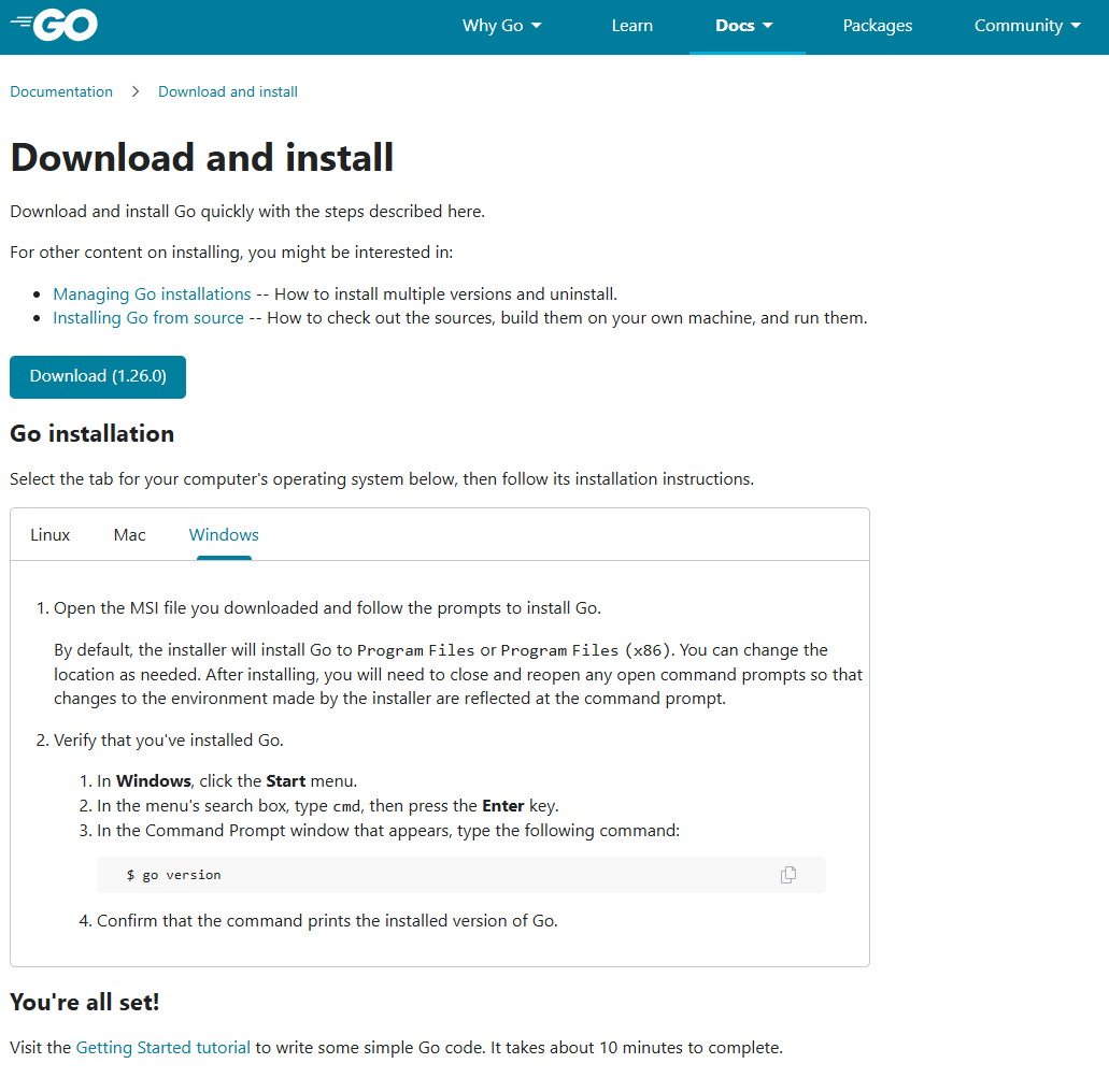 从官方页面安装 Go。 这会安装编译器、标准库和许多工具,用于在 Go 开发过程中执行各种常见任务。 若要安装 Go,请执行以下步骤: