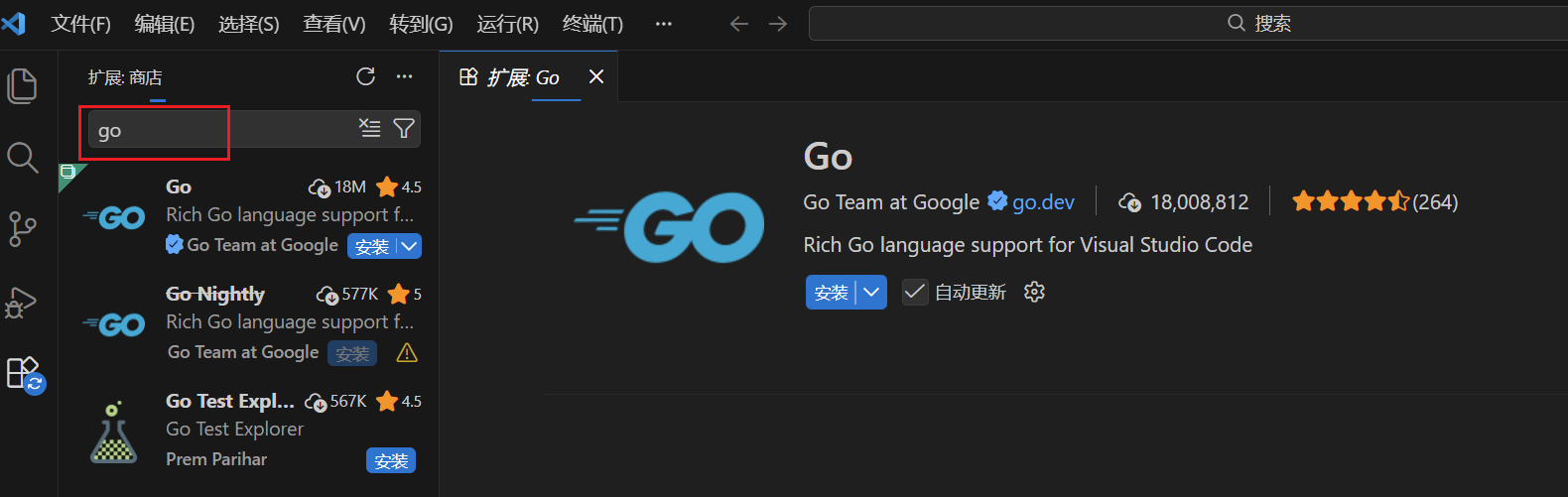 集成开发环境推荐GoLand和VSCode,后者是免费的。VSCode需要额外安装支持Go语言的插件,如下图