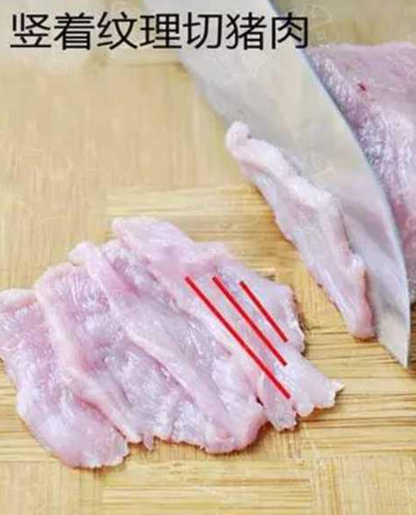 竖切猪:指切猪肉时,可以顺着肌肉纤维方向切,尤其用于炒、炖、红烧类菜肴。