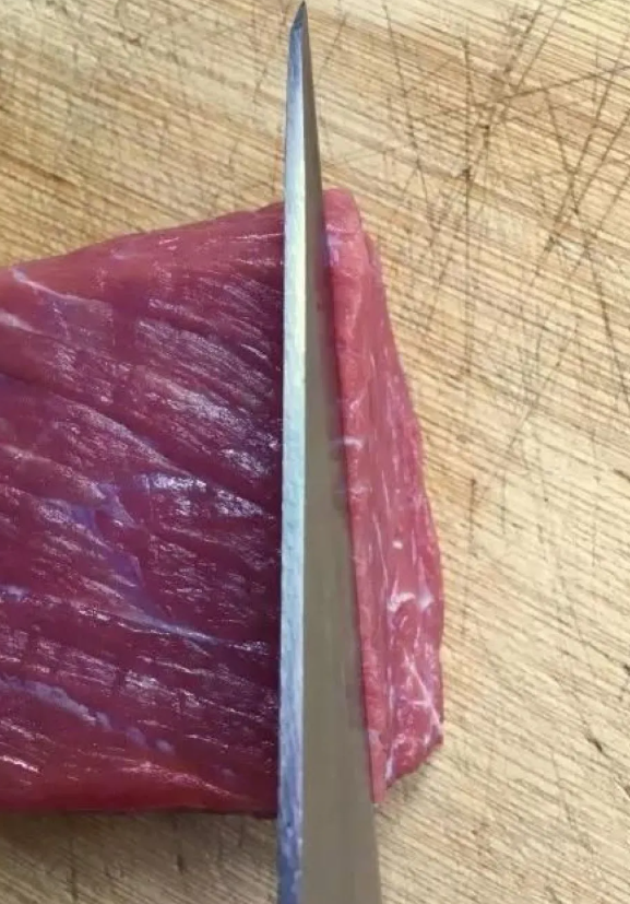 刀身与砧板垂直切:切口小,肉片卷曲易老。
