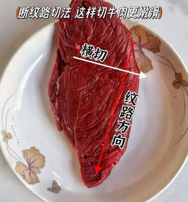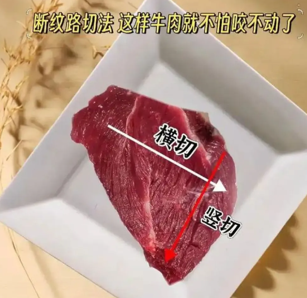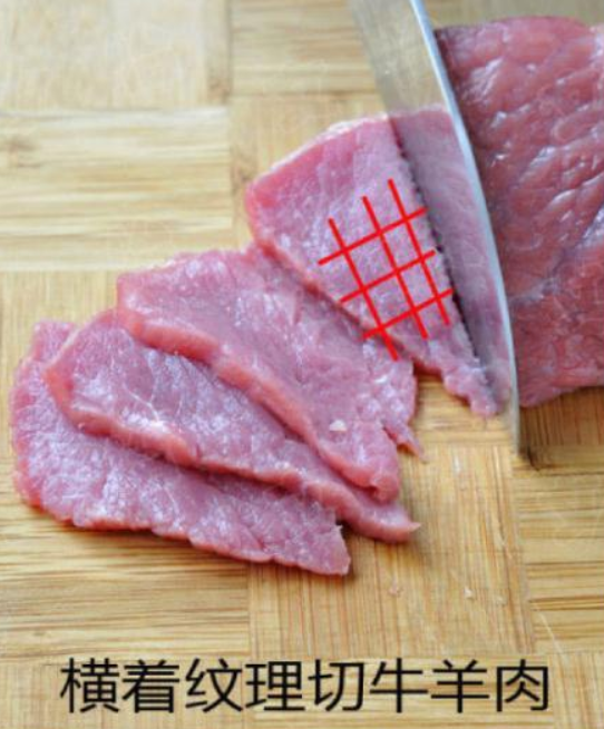 横切牛羊:指切牛肉、羊肉时,要横着肌肉纹理方向下刀;