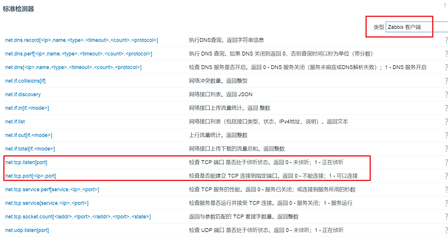也可以基于服务端的简单检查进行监听,骑着net.tcp.service的参数需要填写service,因此智能识别zabbix预定的服务类型,不适合随机端口的监听,不是只连端口,而是会做简单协议校验,比 tcp 更“懂业务一点”。