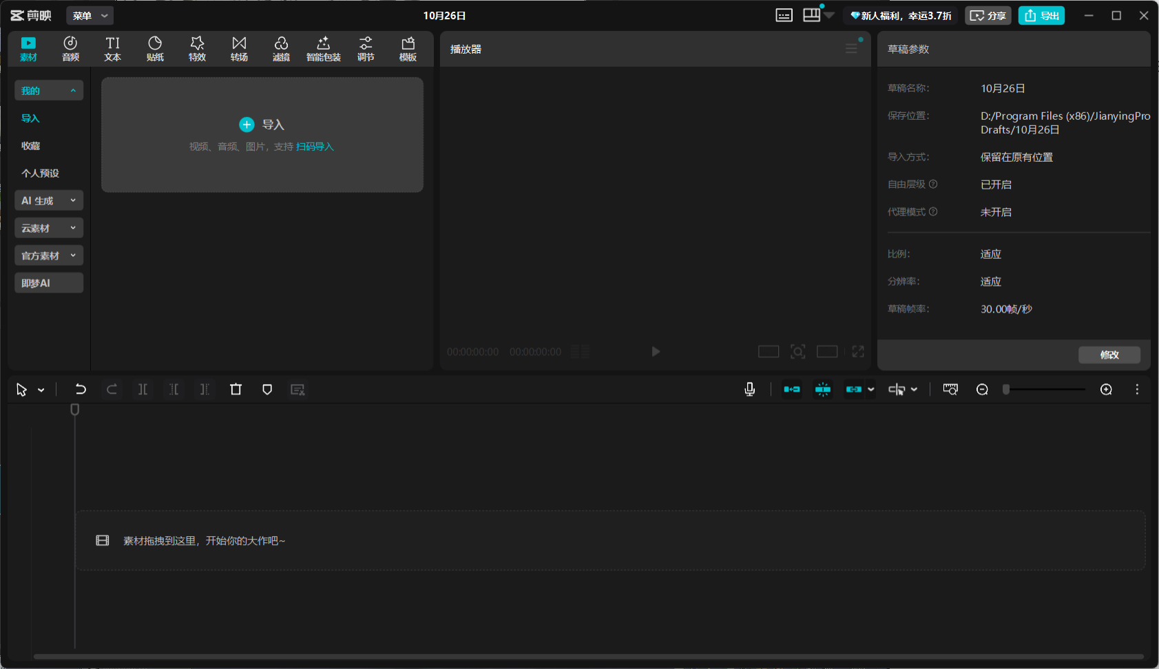 剪映桌面版延续了移动端的直观逻辑:时间轴、轨道、素材区、预览区布局清晰。