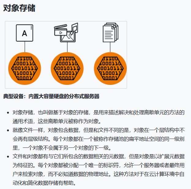 对象存储的通用定义也强调:它以对象/Blob 组织数据,区别于文件层级与块寻址。