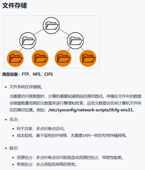 文件存储(File Storage / NAS):上层直接看到“目录/文件”层级。