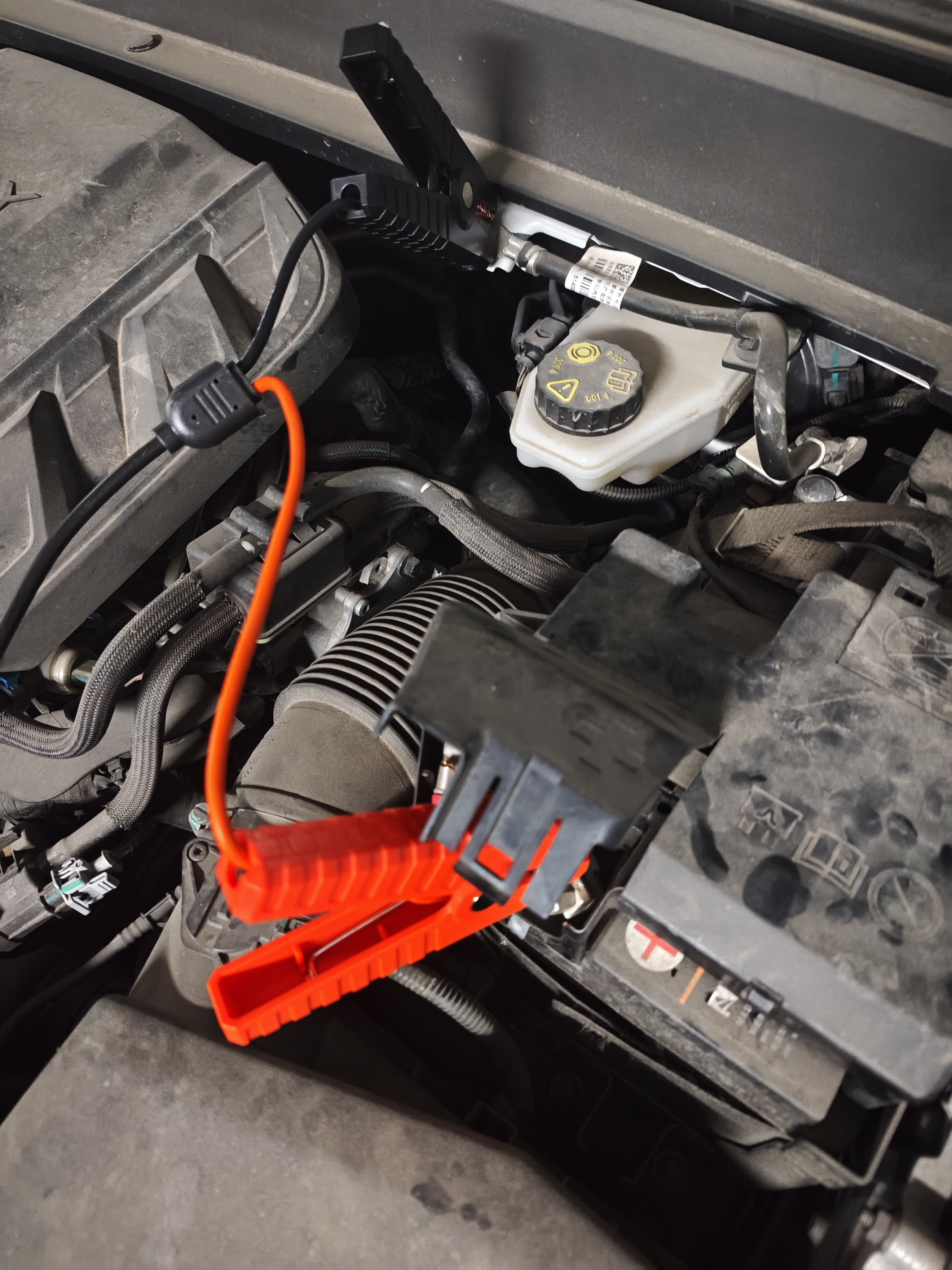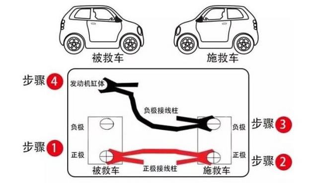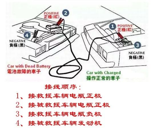 1️⃣ 连接救援车正极(红夹) → 亏电车正极(红夹)