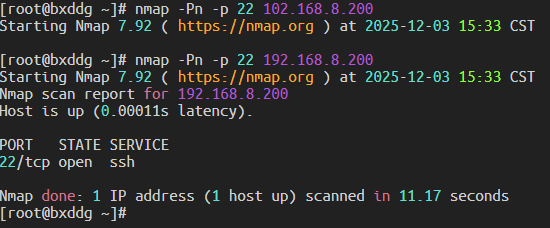 ssh -p 端口 目标IP -o ConnectTimeout=3 "exit"• 通过尝试建立SSH连接并立即退出验证端口。