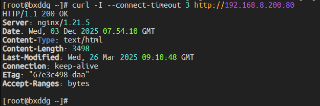 curl -I --connect-timeout 3 http://192.168.1.100:80• 成功 :返回HTTP状态码(如