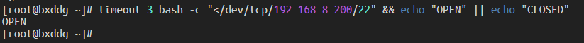 timeout 3 bash -c "</dev/tcp/目标IP/端口" && echo "端口开放" || echo "端口关闭"• 原理 :通过Bash内置功能直接操作TCP套接字。
