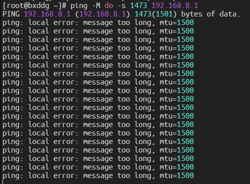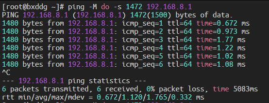 -f:设置 DF,不允许分片-l 1472:发送 1472 字节的 ICMP 数据