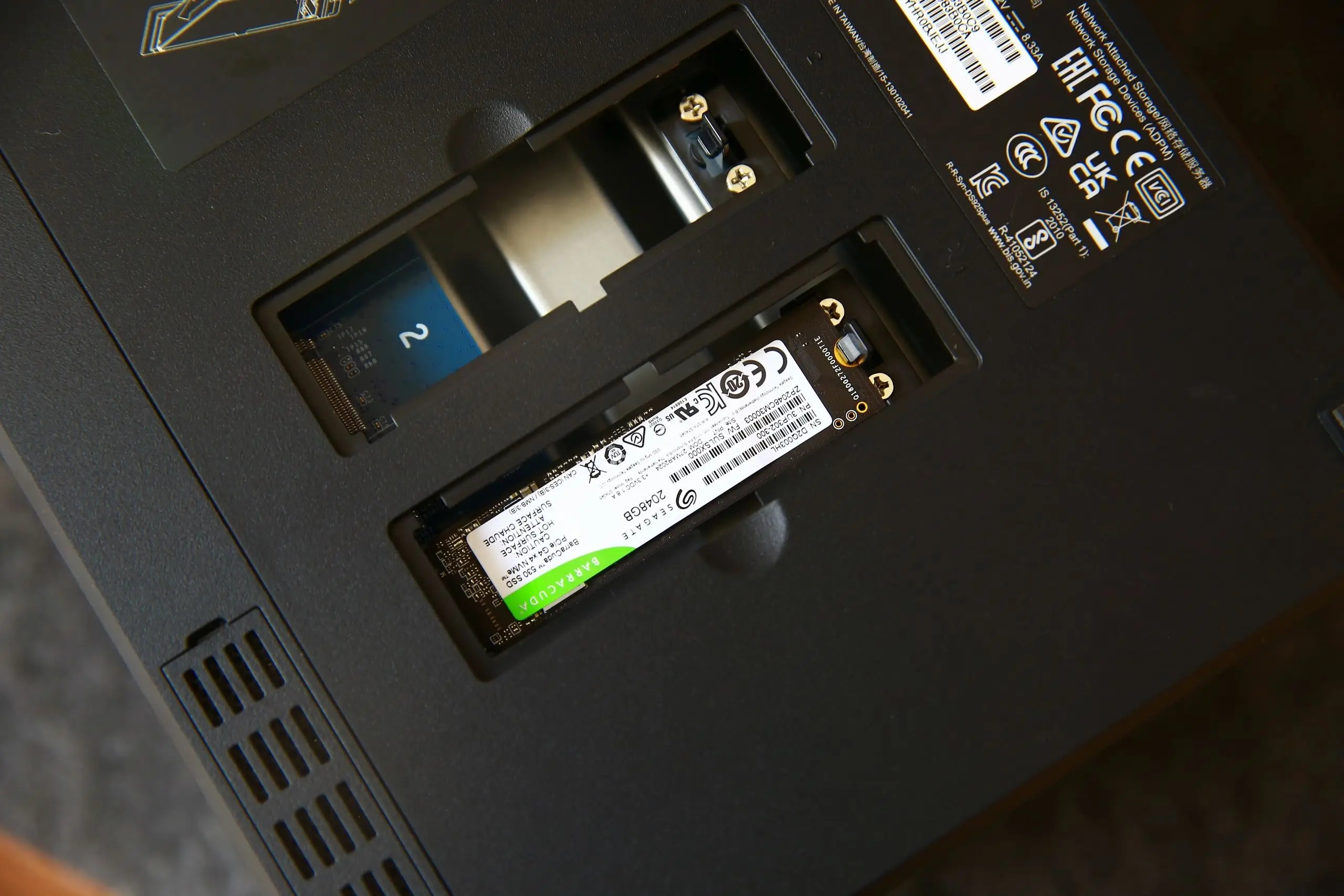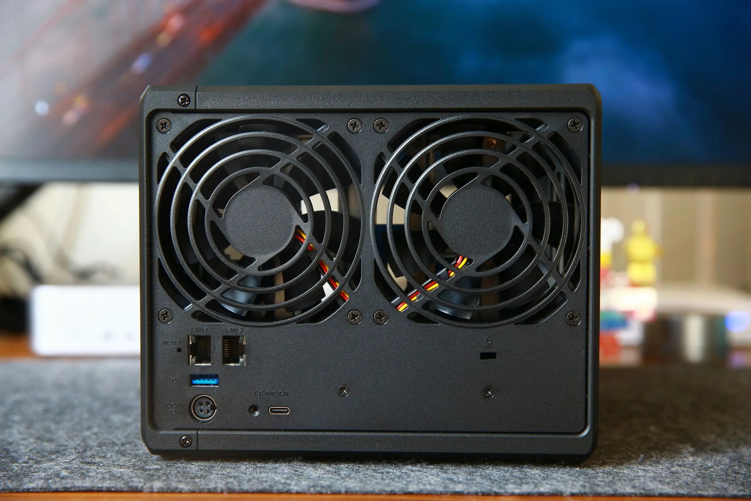 DiskStation DS923+拥有两条DDR4内存插槽,出厂预装单根4GB,最大支持32GB内存,实际可以读取并识别单条32G共计64G内存。接口方面,DiskStation DS923+拥有两个千兆网口,两个USB3.2 Gen1 Type-A接口,一个eSATA接口,内部还有一条规格为PCI-E 3.0x2网卡升级插槽。