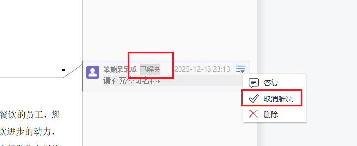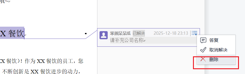 对于批注状态,也可以在确认无误的时候,选择解决或者删除,已解决批注会置灰。