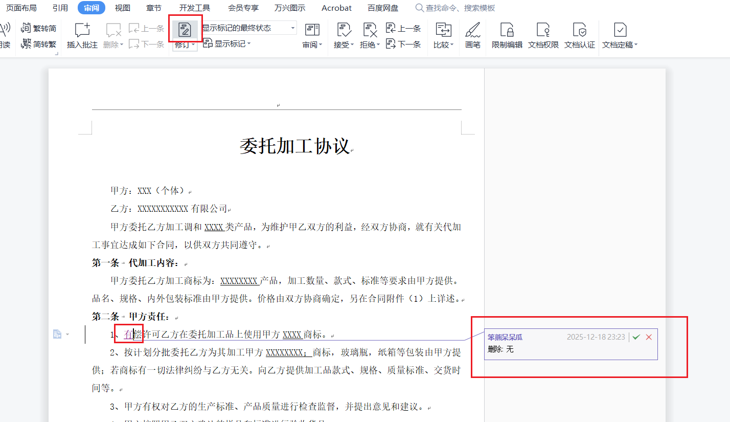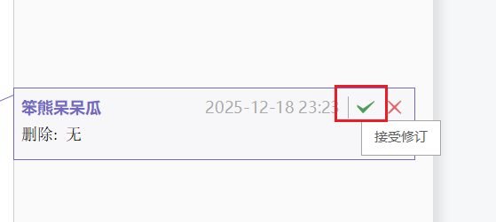 单击接收修订,会显示最终状态,单击拒绝修订会恢复到原始状态。