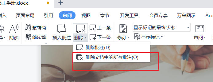 当对文档已经彻底完成修改,并进行备份的时候,可以对批注进行删除