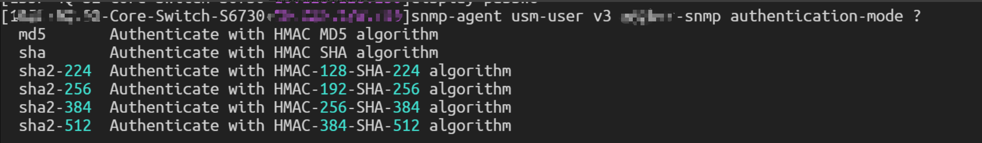 snmp-agent usm-user v3 acyber-snmp bxddg-group可选的认证算法如下所示
