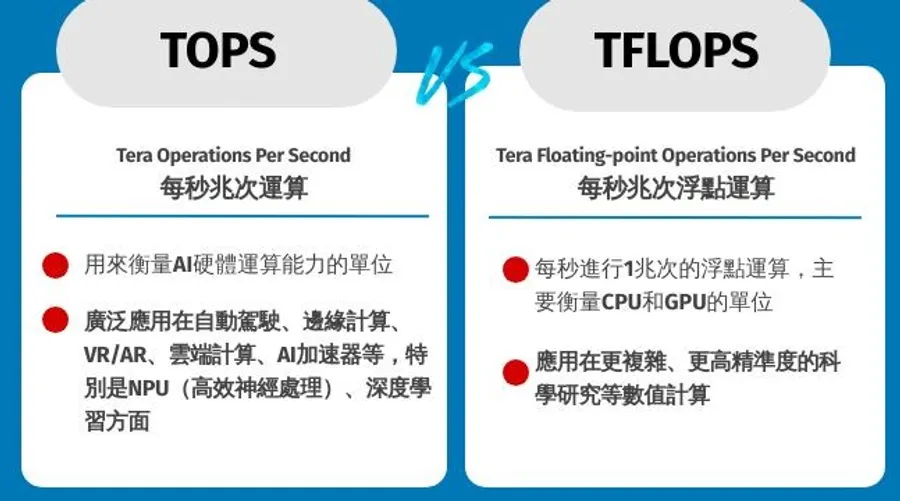 AI模型训练和推理不光需要 FLOPS,还需要专门的 TOPS(Tera Operations Per Second,每秒万亿次定点运算)。