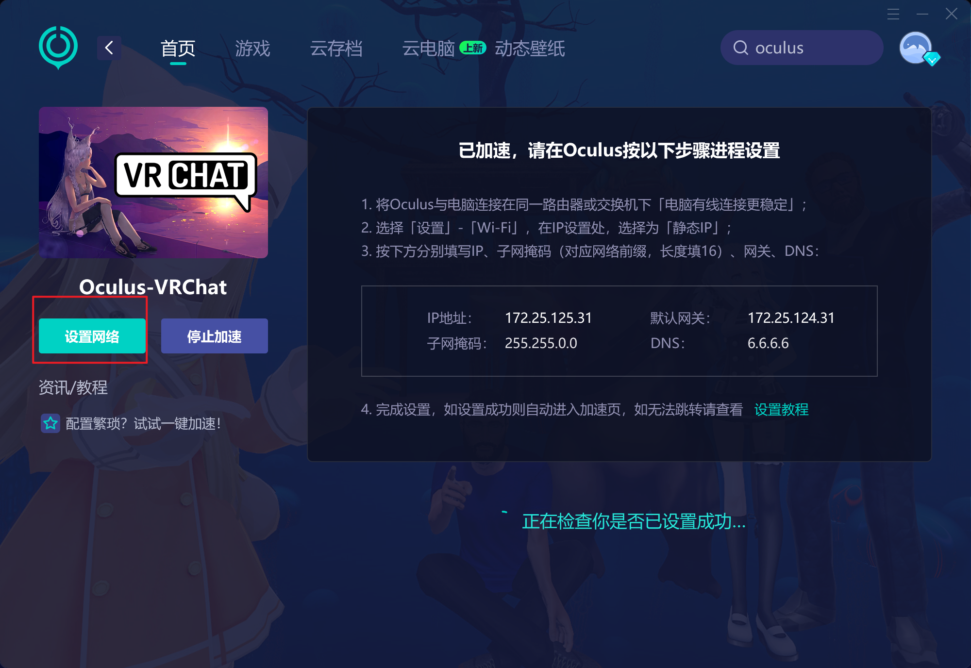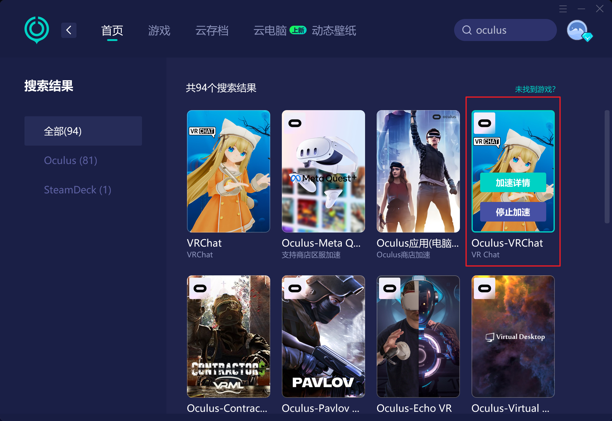 第一步:下载uu电脑版搜索oculus,然后选左上角带有oculus的游戏,推荐vrchat,多人激活成功,有两个vrchat,如果你选择没有oculus图标的那个,会没有设置网络选项