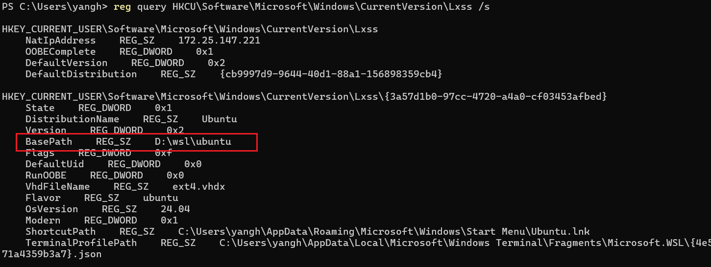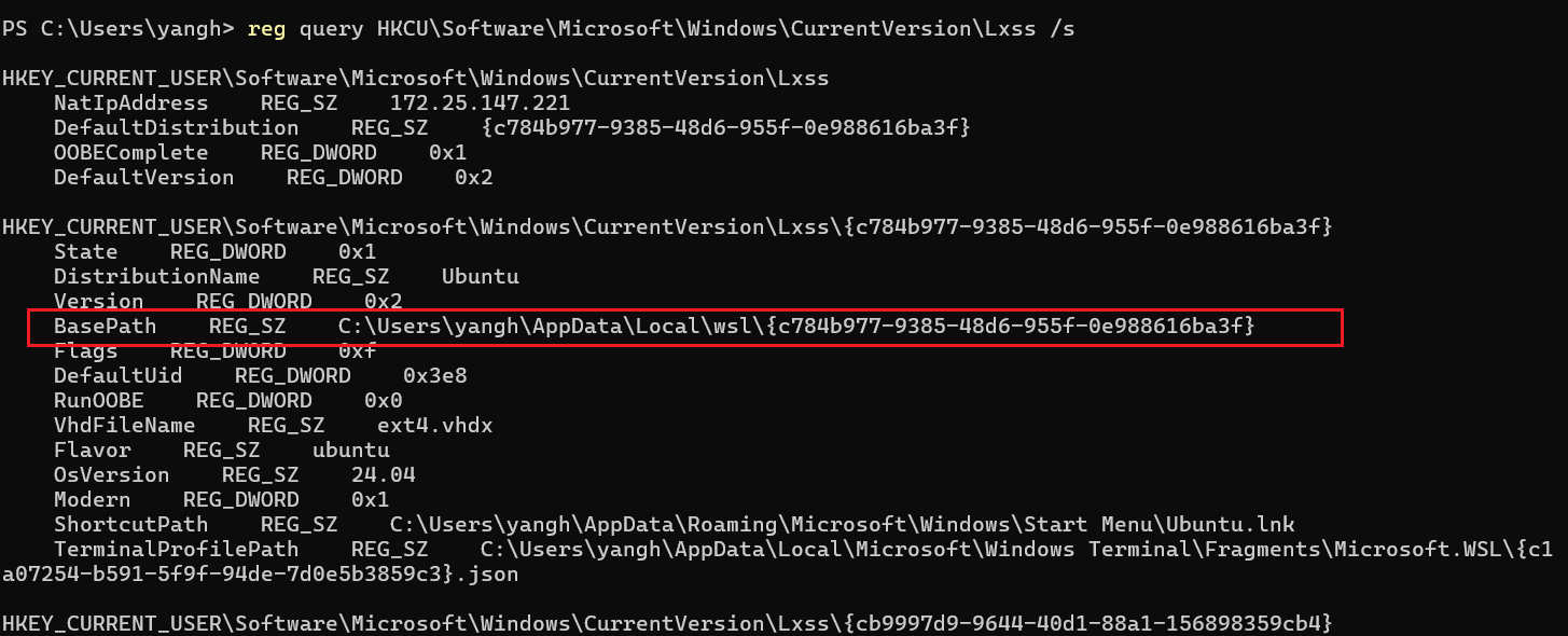 reg query HKCU\Software\Microsoft\Windows\CurrentVersion\Lxss /s