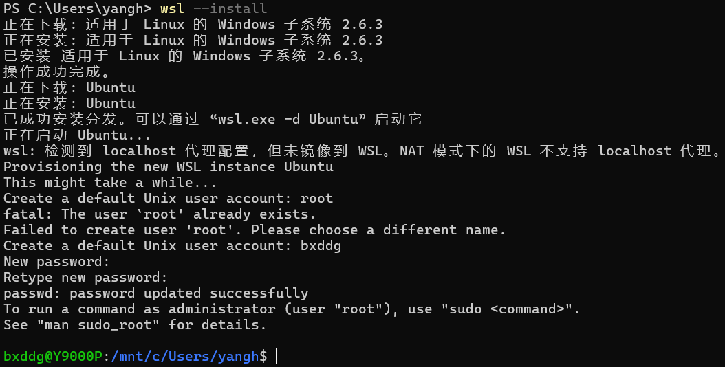安装 WSL2 和默认的 Ubuntu 发行版(你也可以更换)