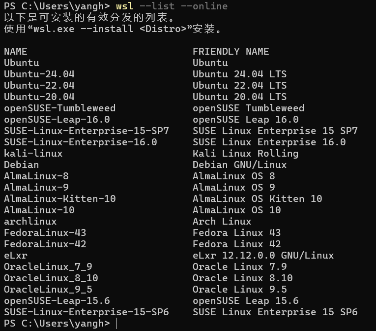 列出所有可安装的WSL Linux发行版列表