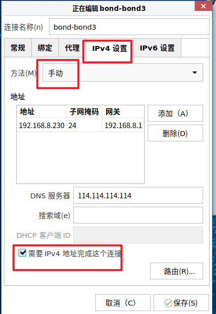 在 Bond 主接口配置界面中,配置 IPv4: