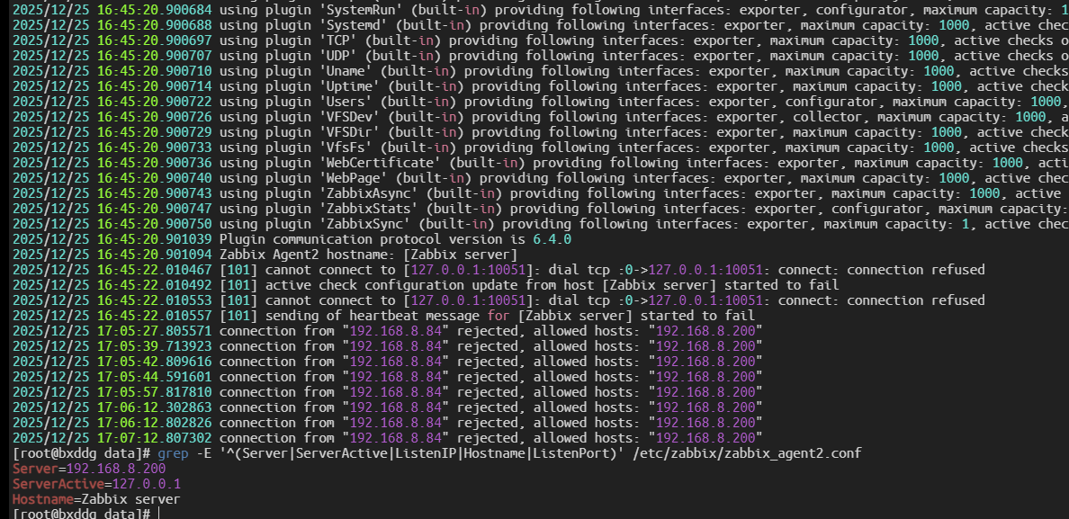 通过日志可以发现,如果网络较为复杂, Server端有多个地址,可以修改agent的配置文件为实际地址或者全0地址Server=0.0.0.0/0