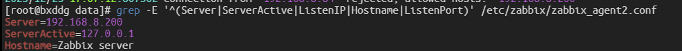 grep -E '^(Server|ServerActive|ListenIP|Hostname|ListenPort)' /etc/zabbix/zabbix_agent2.conf如下所示,如果网络环境较为复杂,可以将地址改为