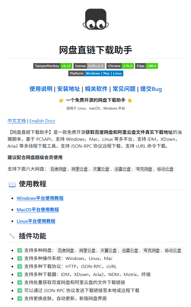 下载 篡改猴 插件和转换直链的脚本: