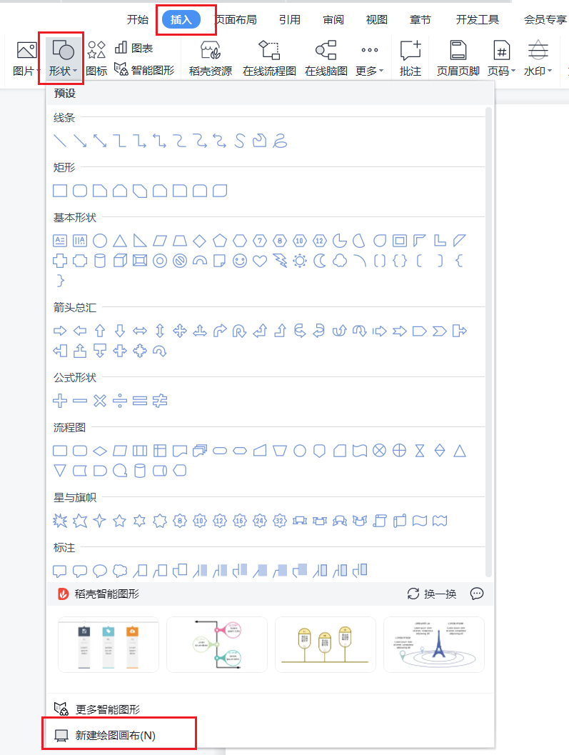 在添加流程图形状前需要先插入绘图画布,这样才能实现链接符与流程框的智能连接。