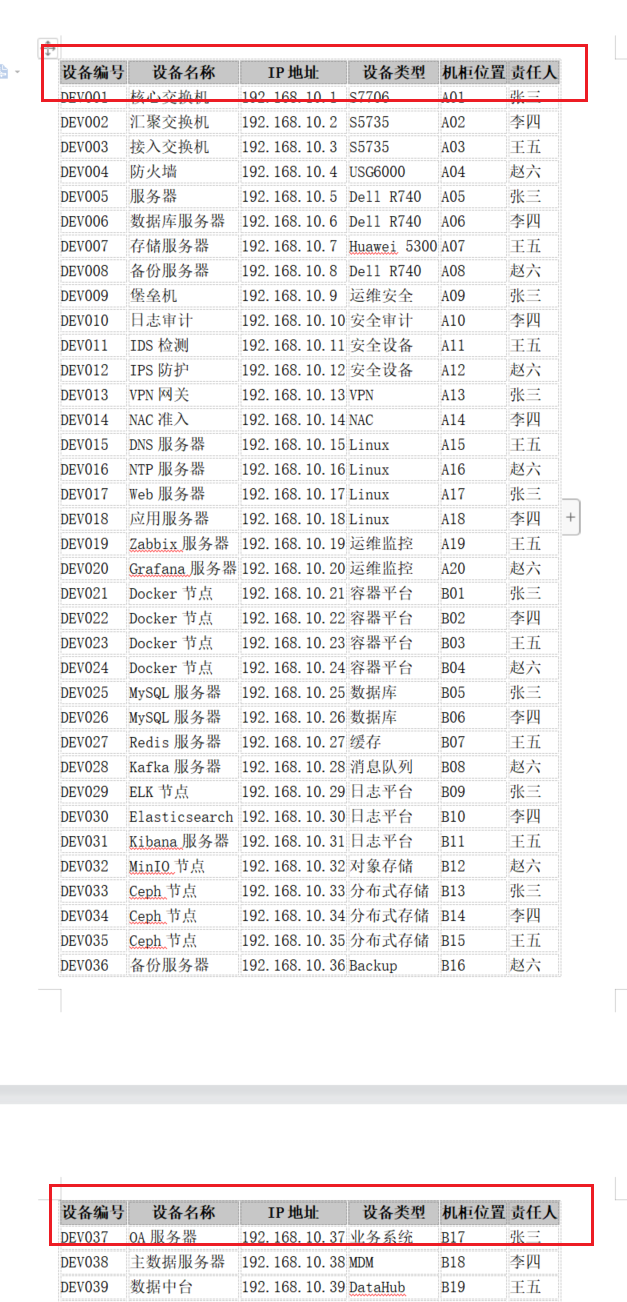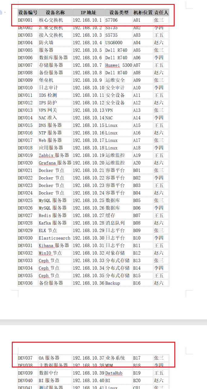 | 设备名称 | IP地址 | 设备类型 | 机柜位置 | 责任人 |