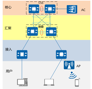 多台接入层iStack堆叠,2台汇聚层CSS集群堆叠。