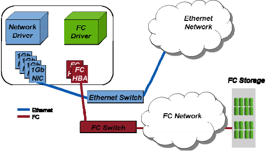 在数据中心中,传统的存储网络(SAN)与业务网络(LAN)通常基于完全不同的技术: